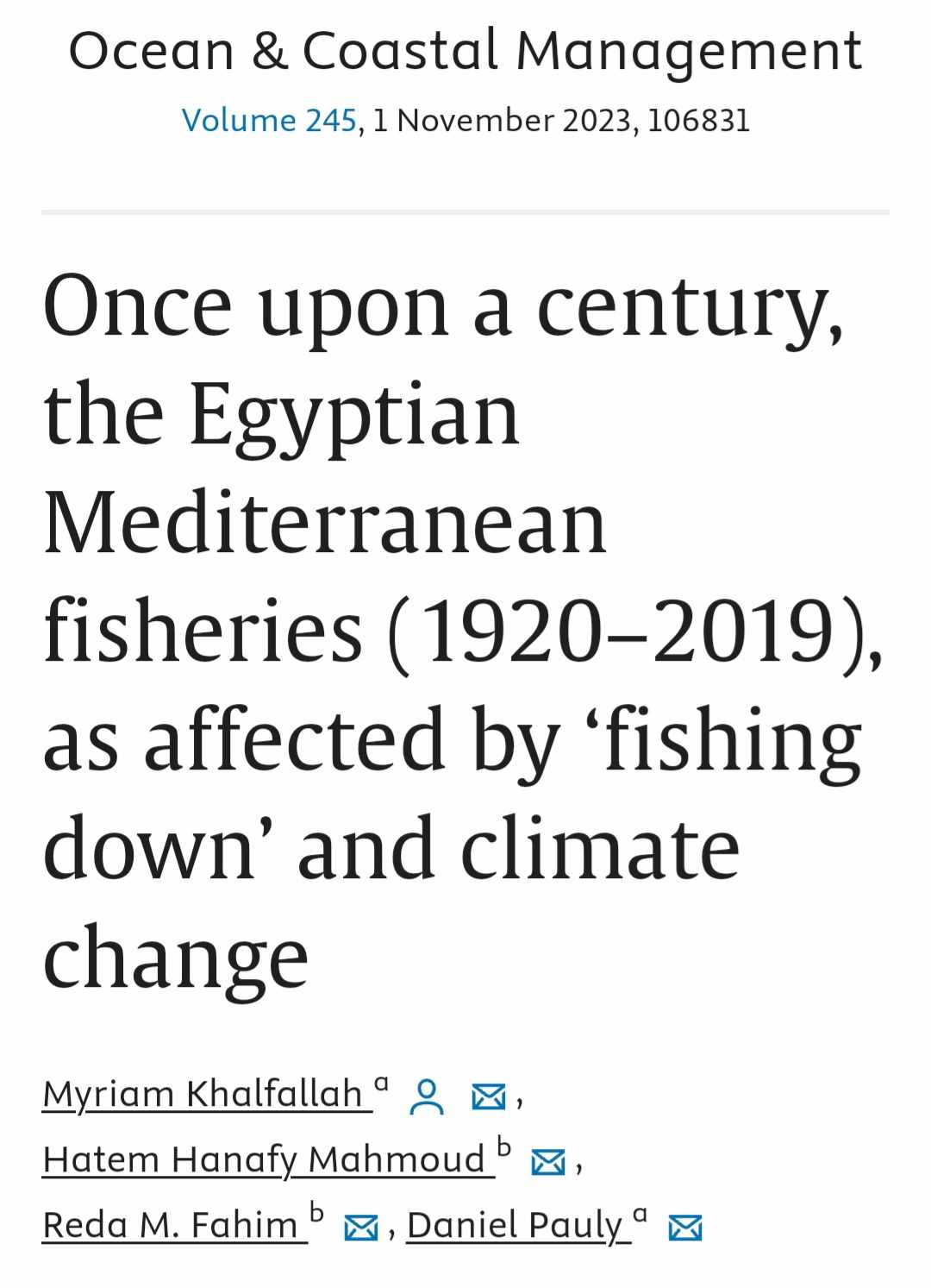 Our scientific paper “Once Upon a Century, the Egyptian Mediterranean Fisheries (1920-2019), as affected by ‘fishing down’ and climate change” is now published in ‘Ocean and Coastal Management’.